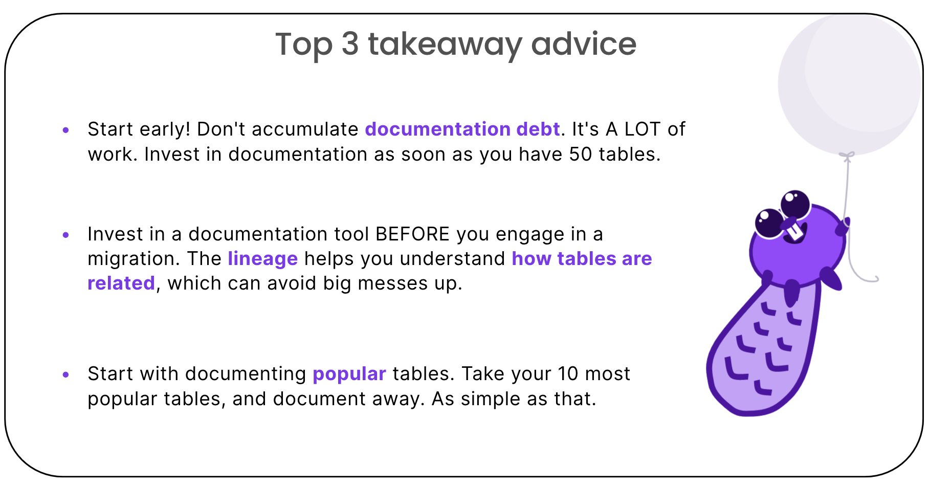 Arnaud: I think you can’t solve all user's needs, you need to pick the needs you wish to prioritize. As Lauren said, you need to pick the main use case that you wish to solve. Solving this particular use case will create assets within the tool that will help other users, covering different use cases. Our use case is discovery, not data quality, not data observability, or anything else. Discovery is just making sure that people can find and use autonomously the data they need to do their daily job. It is also a way to provide a smooth entry to business folks in your data stack.